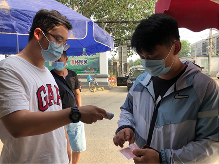 新三余村外來人口較多,進出人流量大,值守檢查不能有絲毫的馬虎,在做好自身防護的情況下,認真檢查進出人員的出入證與身份證、測量體溫、并做好登記工作。