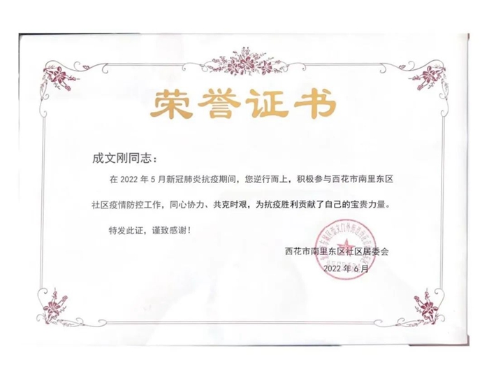 近日,東城區西花市南里東區社區居委會為化研院共產黨員成文剛頒發了榮譽證書,以表彰他積極參加社區防控工作。