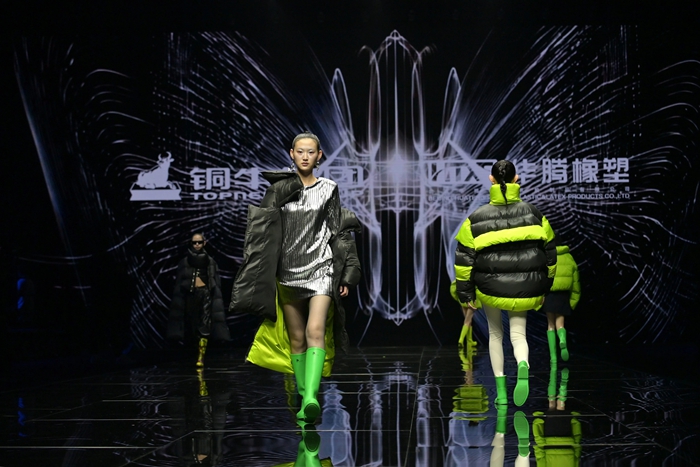 整個秀場,靚麗前衛的膠靴或踏于足下,或成為時尚新品挎于體側,伴著強勁的樂曲,綻放出化工科技在時尚前沿的另類美學。